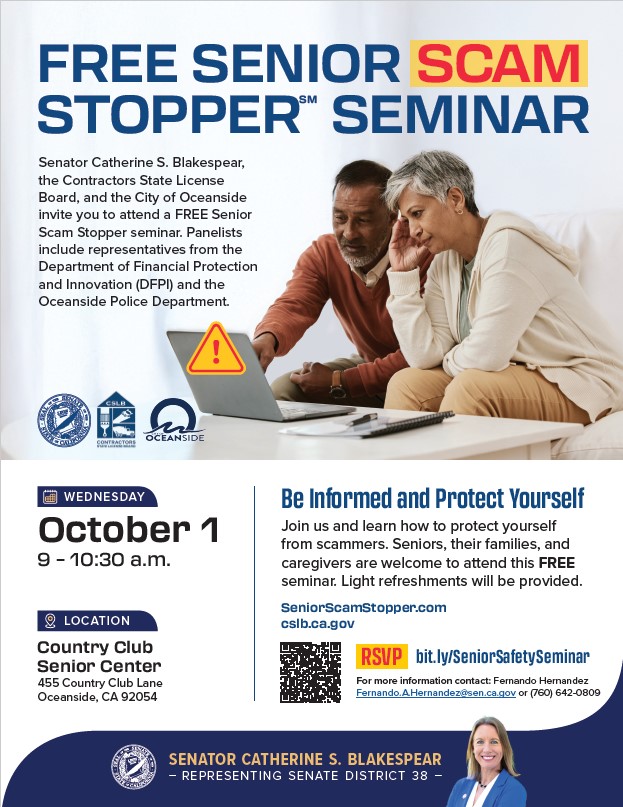 Senator Catherine S. Blakespear and the Contractors State License Board invite you to attend a FREE Senior Scam Stopper seminar. Panelists include representatives from Department of Financial Protection and innovation (DFPI) and the California Department of Insurance (CDI). RSVP here.